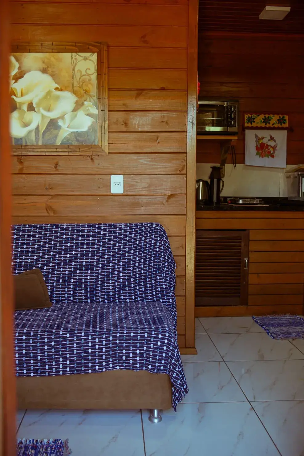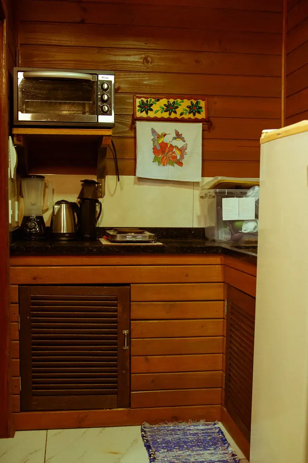 Pia, Geladeira, Forno elétrico, Liquidificador, Chaleira elétrica, Garrafa térmica, Panelas, Pratos, Xícaras, Copos e Talheres.